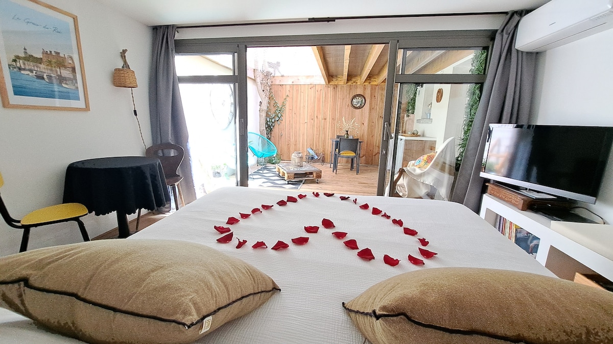 Venez profiter d’un moment à deux hors du temps, idéalement situé entre Lattes et Palavas, à seulement 5 minutes de Montpellier. Chambre privée avec douche balnéo, salle de bain, toilettes et télévision, ouvrant sur un patio privatif avec cuisine d’été et jacuzzi. Piste cyclable vers Palavas à 2 minutes, marché, restaurants et plage à proximité. 🌿 Massage bien-être 25€/20 min sur réservation (atelier à côté). Petit déjeuner inclus.