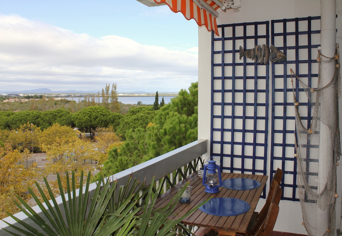 Large flat, view on the "gold pond " ,"Pérols pond" , "Pic St loup" mountain, is very nice from the terrasse. Sometime the sunset on eastern, are wonderful. All shops and restaurants are very closed, the flat is situated around the port. You can go to the beach 10’ by foot.