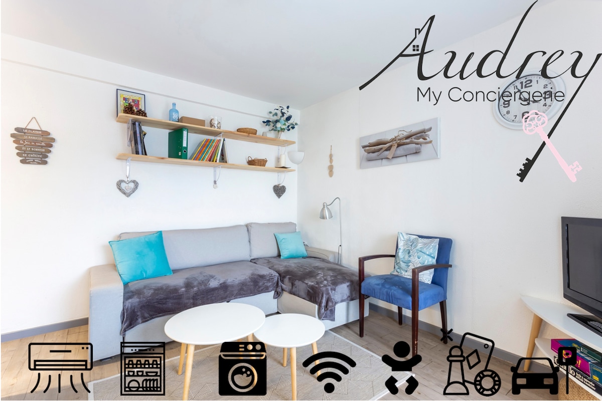 We created this 40 m2 apartment to accommodate our friends and family. All the comfort on the ground floor, in a quiet street close to the shops. The living room with equipped kitchen and lounge area. The bedroom for 2 people (queen size bed) with shower and sink. as well as a 10m2 terrace. -parking card for all car parks except number 1. -10% discount on massages I offer We remain at your disposal for any request or additional need.
