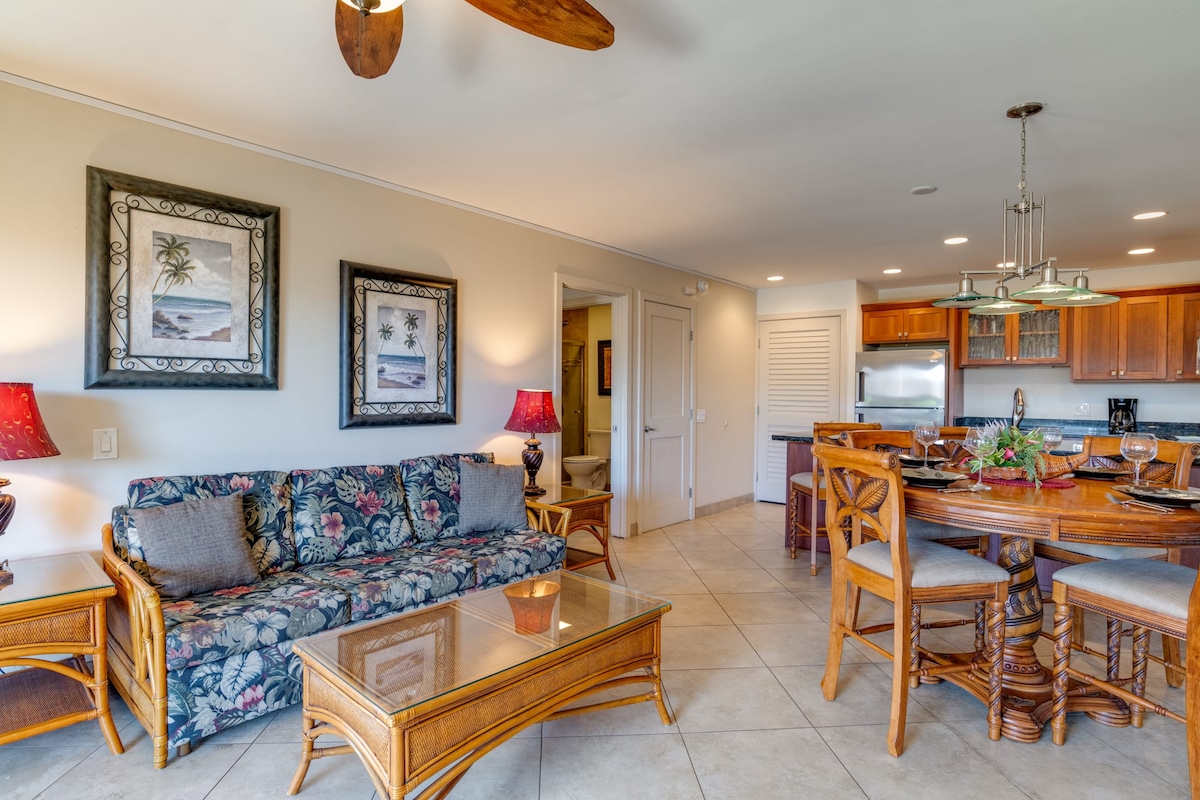 Maui Vista, stunning beach look full 1 BR condo. In building 2 overlooking the pool. Newly updated April 2022.New Tv, couch, painting and lighting along with new patio furniture. This complex is highly rated complex for its location and quality. Great place to relax or spend time at the beach. Access to all the activities of Maui is unparalleled. Enjoy the air con and the beauty of the sun. 1 bedroom with King size firm bed and Double size fold out couch in the living room.