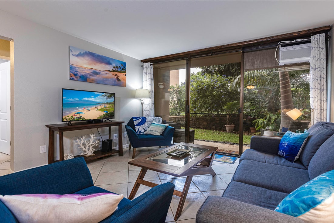 Our apartment (D202) is a beautiful, 2nd floor poolside villa that is located in the popular Kihei Bay Vista condominium. Centrally located, our charming suite is only a few steps from the pool and right across street from the beach. This classy suite is a stylish, relaxing and immaculately clean vacation space. It comes equipped with an incredibly comfortable KING size bed, a cozy sleeper sofa, an airbed, and everything else you would ever need to feel right at home.