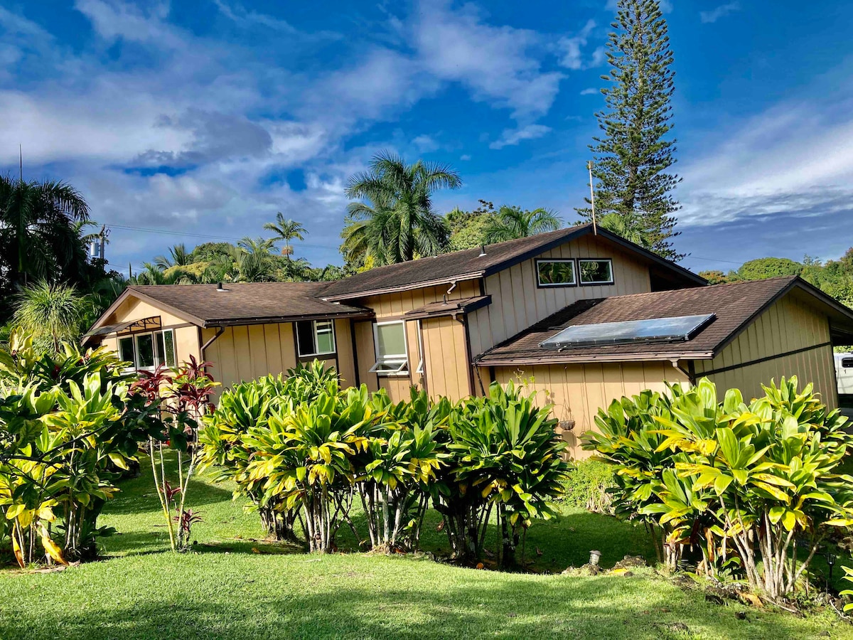 Aloha! The Hana Harvest Cottage is the perfect place to unwind and explore the beauty of Hāna and the surrounding area. Fully renovated and re-furnished including new modern appliances, new organic cotton mattress, WiFi, and upscale modern tropical decor you will feel pampered while nestled in nature. Perched at the level of the treetops, the birds-eye view of the surrounding trees and flowers can be seen from every window and especially enjoyed from the large lanai with beautiful ocean views.