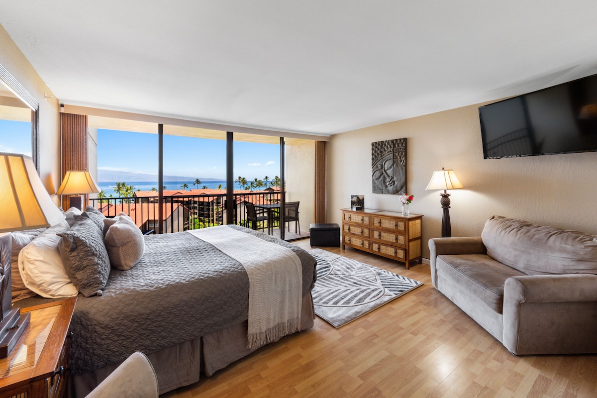 Welcome to the Royal Kahana! Views from your private lanai are first class. View includes ocean, sunset, neighboring islands, mountains, and even humpback whale breaches. Relax at our upgraded studio which has all the amenities you need for an amazing stay. Recent upgrades include updated lighting, artwork, furniture, all new bedding and pillows, new and additional seating on the lanai, and OLED tv. USB ports by bed and kitchen. Great for couples, with sofa bed we can accommodate 3.