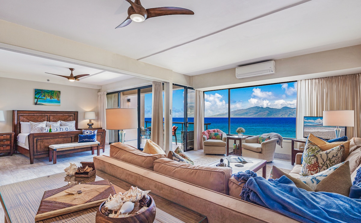 Locally Owned and Operated Studio condo with the best direct beachfront location, panoramic Ocean views, sunsets, and seasonal whale watching. The owner’s spared no expense in renovating this unit making it hand’s down one of the nicest units in all of the Mahana. Wake up to the cool tropical breeze and sounds of the shoreline just 50 feet away. Located on North Kaanapali Beach. Enjoy stunning views and the warm Maui sun inside while central AC keeps you cool and comfortable any time of day.