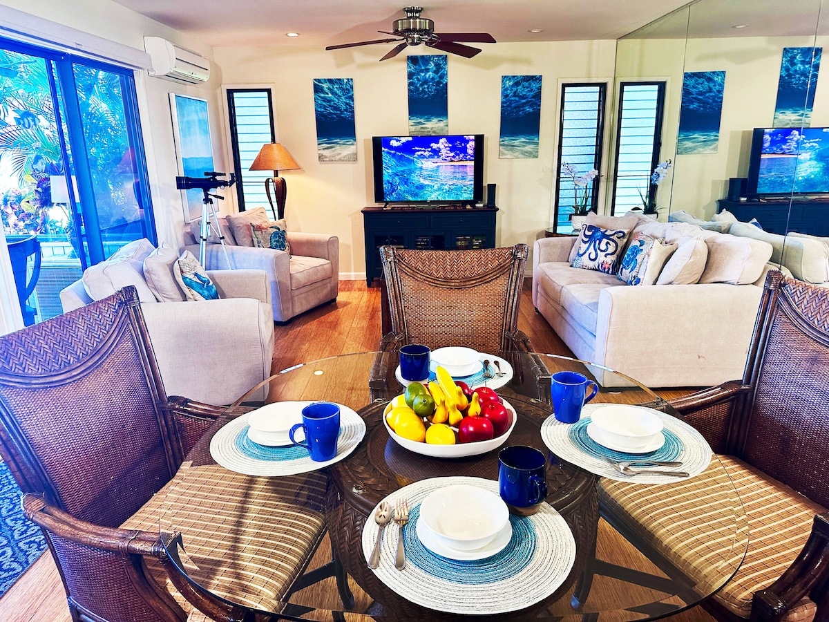 This rare ocean-front condo (LEGAL vacation Rental) is stunning! We call it a "Cruise ship view" cause you can't get any closer to the water than this! Listen to the sound of the ocean from the comfort of your home, while watching whales (Dec-April) and Hawaiian Green Sea Turtles frolicking all year long! Fully stocked, has A/C in living room and bedroom. Located a five minute walk from boats, Maui Ocean Center Aquarium, shops and restaurants at Ma'alaea Harbor!