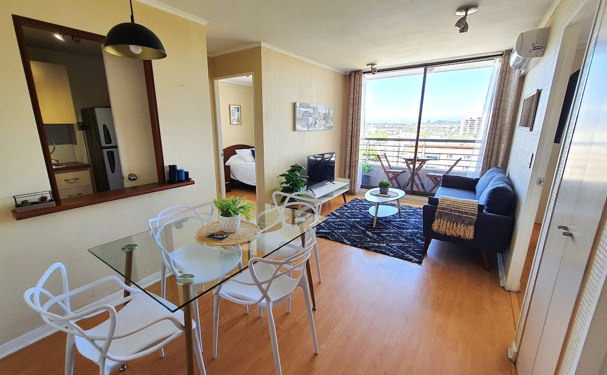 Este lugar único tiene su propio estilo. Este acogedor departamento está en el 5to piso, aunque no hay asesor, cada escalón te acerca más a una vista espectacular del Cerro Carlos Condell y un espacio lleno de estilo. Con una cama King, cocina equipada, aire acondicionado, Smart TV en la sala y la habitación, wifi rápido y zona de trabajo, tendrás todo lo que necesitas. Además, estás cerca de supermercados, centros comerciales y con acceso directo a la Ruta 5.