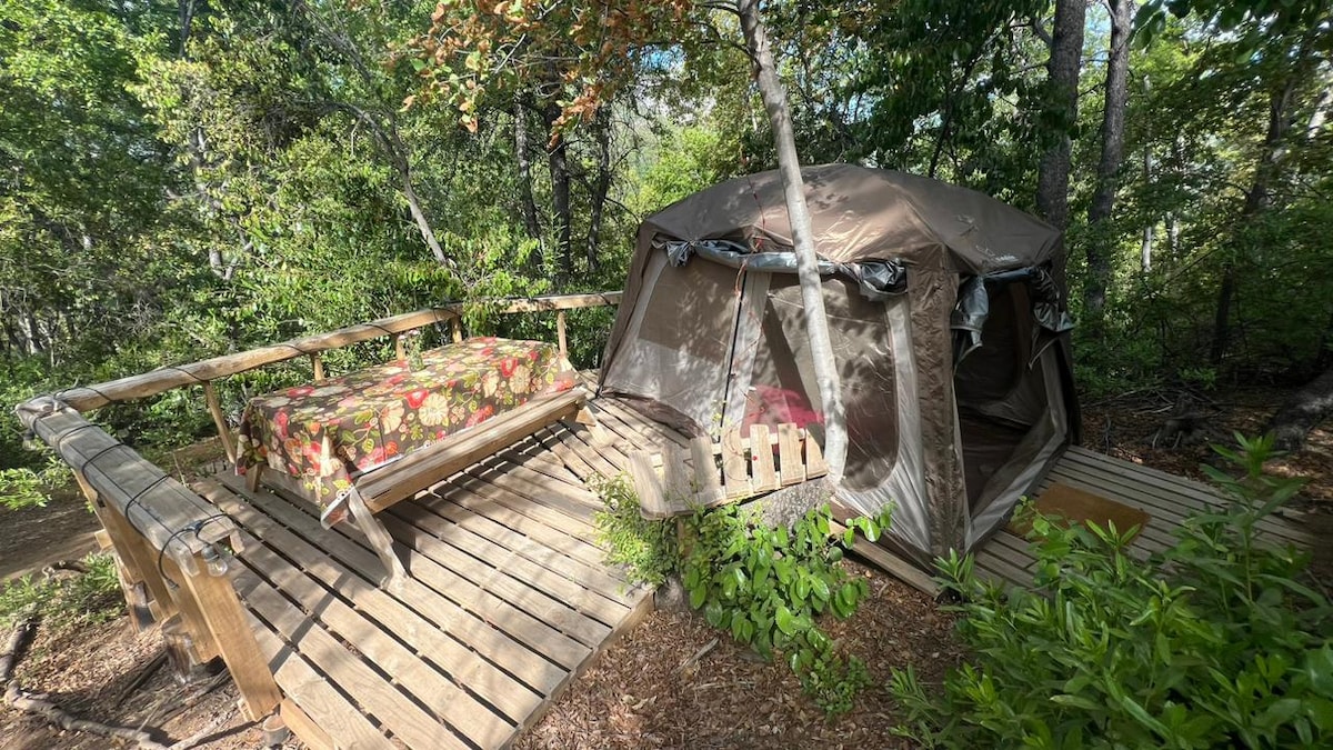This is a comfortable and very private glamping without immediate neighbors. It is a small structure very similar to a tent. There is a double bed with linens. The platform it is on is large and has a hammock and a table and benches. There is a bathroom with a shower that has hot water nearby and an outhouse closer for middle of the night visits. You may reach us walking or by 4x4. We are happy to pick you up at the parking area. We have Starlink wifi and hot water