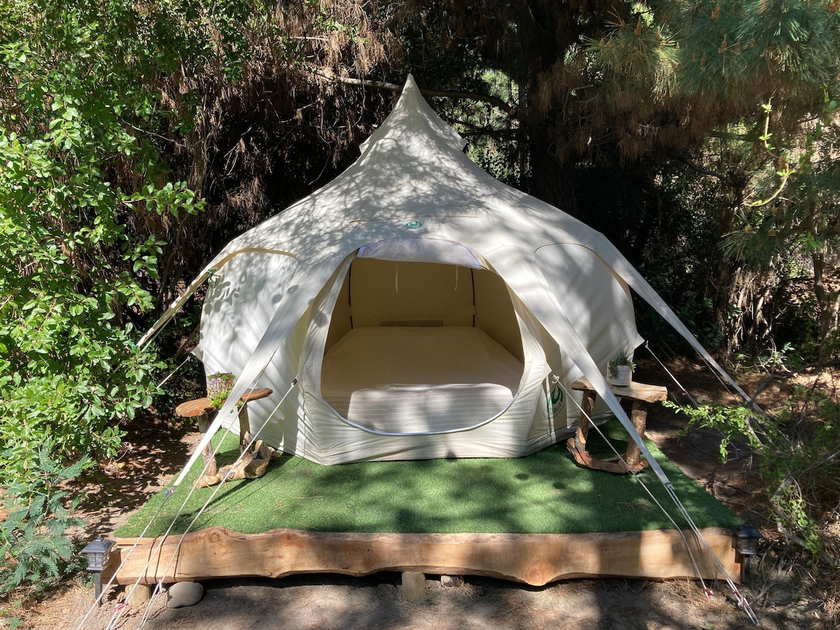 This is a large tent with lots of windows as it gets hot in the summer in this area. The tent has a comfortable double bed with bedding. It has a shared bathroom and shower with hot water close by. The platform it is on does not have any neighbors. There is a table and solar lights on the platform and you are welcome to use our kitchen and fire-pit. The solitude and great views from the property make it a unique stay in the area.
