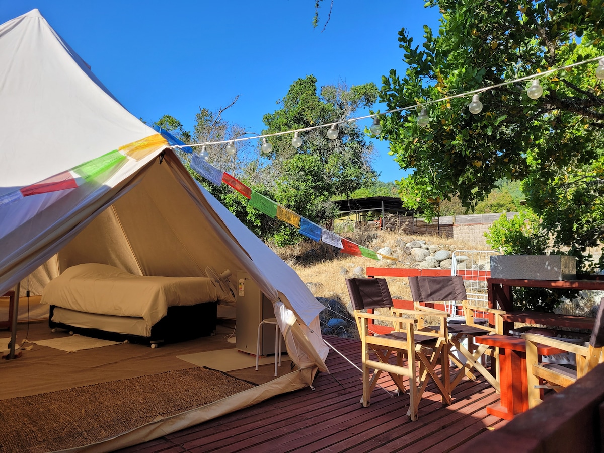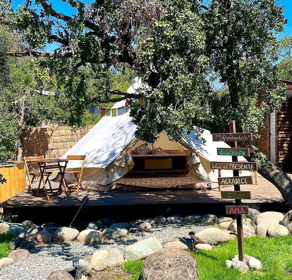 Reconnect with nature at this unforgettable escape. Only 2 hours south from Santiago´s Airport, you will enjoy the astonishing views of Los Andes from this glamping located at Maule Region. Get the charm of a campsite plus the comfort and fun from all the amenities available for our guests: complete kitchen, hot shower, bathrooms, barbecue, fireplace, lagoon with kayaks and paddle surf, play courts and many other activities. Perfect for company meetings with an adventurous flavor.