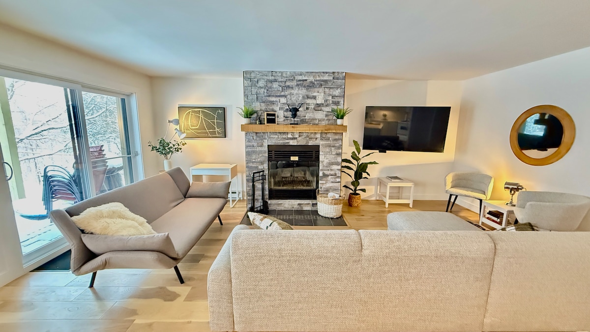 Fully equipped 4-season lakefront chalet featuring AC/heat pump, indoor stone fireplace, outdoor fire pit, 8-person spa, private dock and full fleet of watercraft. High-speed fiber internet and automatic backup generator ensure comfort at all times. Located 1h30 from Montreal on a large swimmable lake with private sandy beach, panoramic views and peaceful forest surroundings. Perfect for relaxation or remote work.