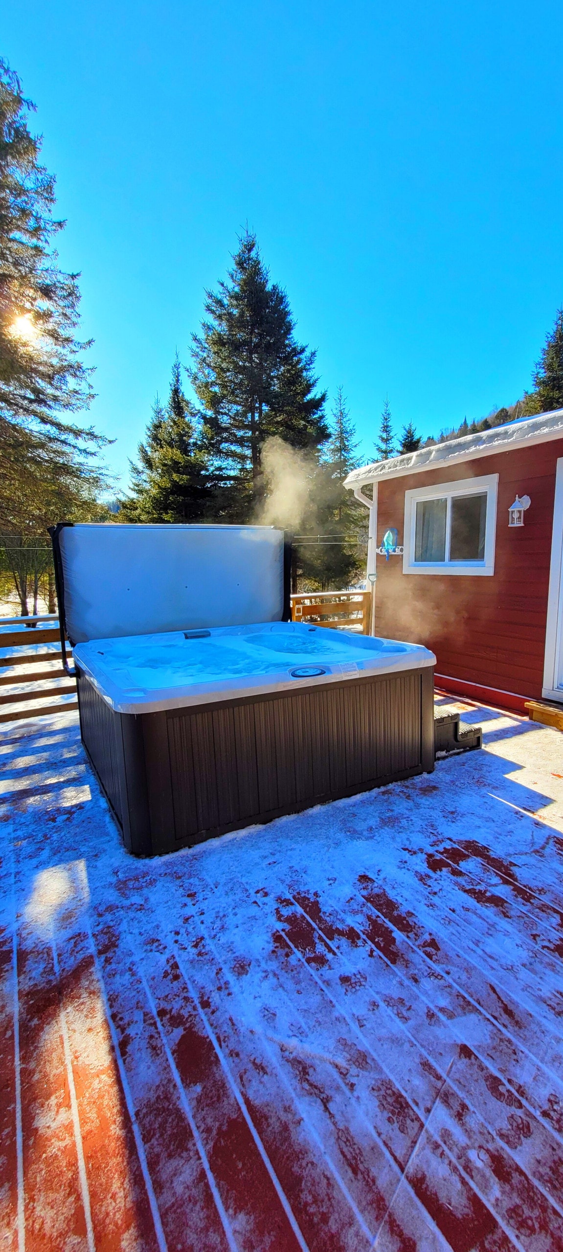 Small moderne warm Cottage! Come relax, unwind and fully rest! Be surrounded by several pine trees. This cottage can greet 2-4 adults (+1 child). You have WiFi and electric fireplace. Its time to disconnect from your daily life with its SPA as well as an outdoor GAZÉBO to fully enjoy it while watching the beautiful views of the mountains! Fishers, snowmobilers and ATV’s its the ideal place for nature lovers. Motorcyclers you will enjoy the road! Access to the river is a 5 min walk! Book Now