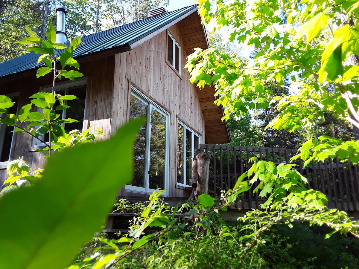 Chalet paisible dans une réserve de biodiversité, au bord d'un lac sauvage de 4km, où s'allient confort et plein air. Poêle à bois, foyer extérieur, BBQ. 1 chambre avec lit double, 2 banquettes-lits simples dans l'aire de vie. Cuisine fonctionnelle. Coin lecture, jeux de société. Douche, toilette sèche électrique. Accès au lac et aux embarcations, pêche, sentiers pédestres, observation de la faune. Aucune résidence autour du lac, sauf celle du propriétaire sur le domaine : tranquillité assurée.
