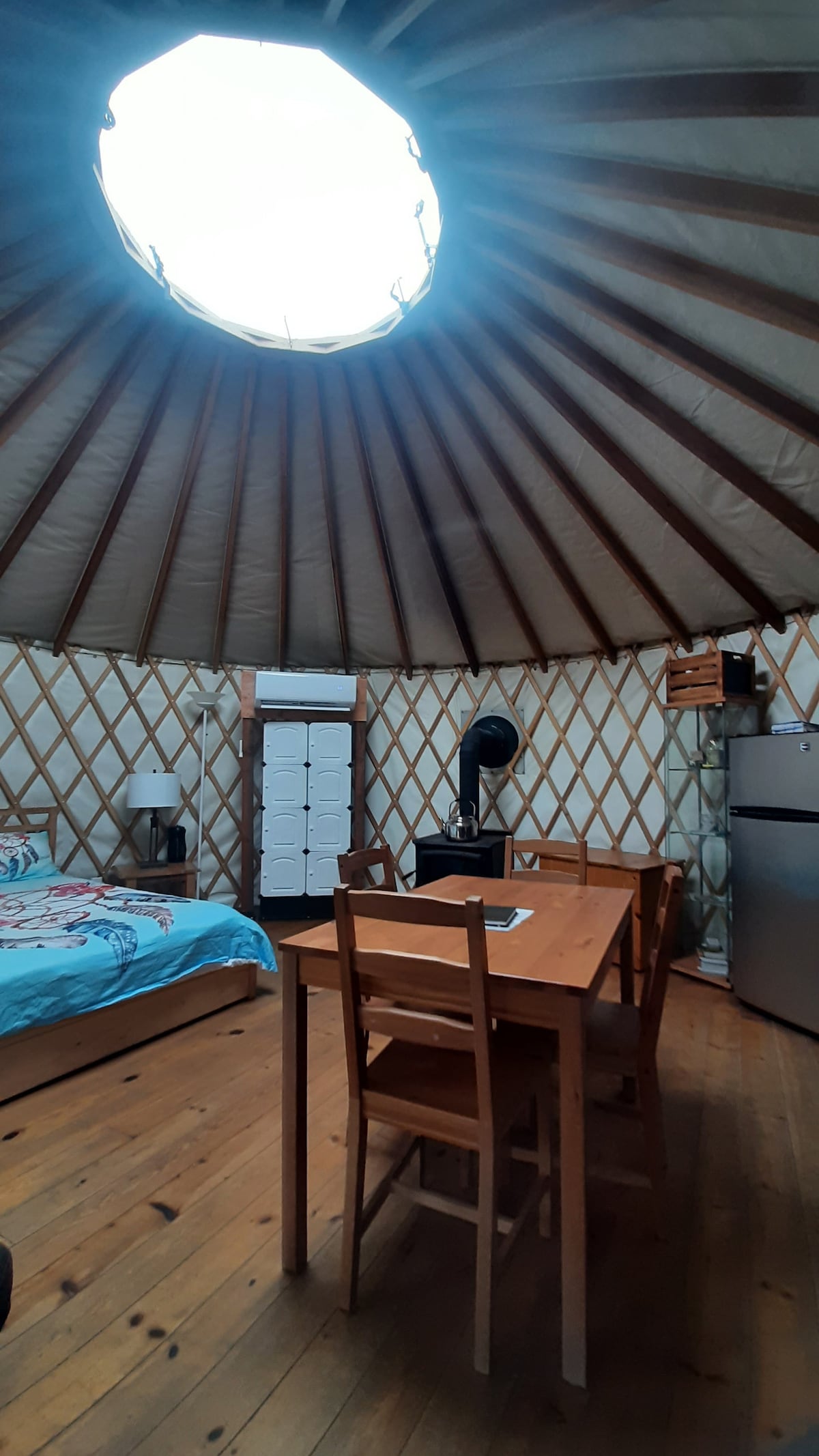Grande Yourte de 24' de diamètre, pouvant accueillir jusqu'à 8 pers. Très luxueuse et chaleureuse dans un décor rustique! ***N'oubliez pas vos draps, taies, couvertures, serviettes. Les oreillers sont fournis. 2 lits doubles-2 lits simples-1 futon double ***Location gratuite de 2 kayaks 1place le temps de votre séjour Un weekend pour partager de merveilleux moments, tout en déconnectant ou se retrouver tout simplement BBQ sur feu de bois.
