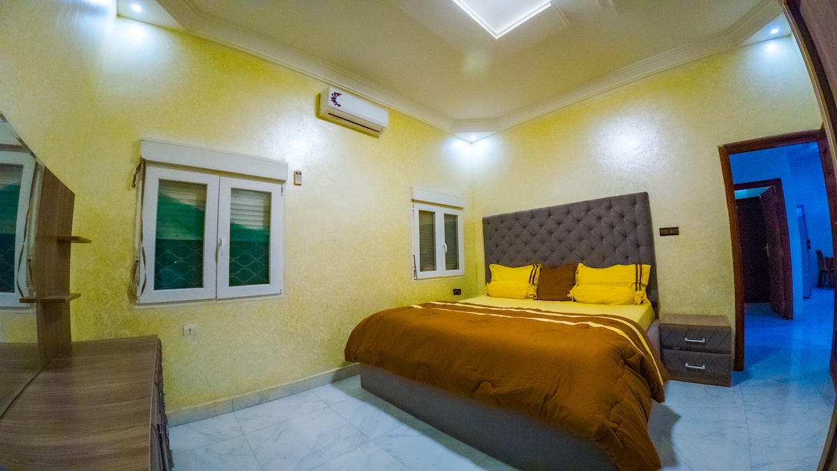 Logement entier situé à 5 mn du centre ville, 5 mn de la plage et du quartier des restaurants à Nouakchott . Dans un quartier très sécurisé le logement dispose de deux chambres dont une suite parentale et un séjour . Le logement peut recevoir 5 personnes . Il offre un confort de haut niveau, complètement équipé et bien agancé.