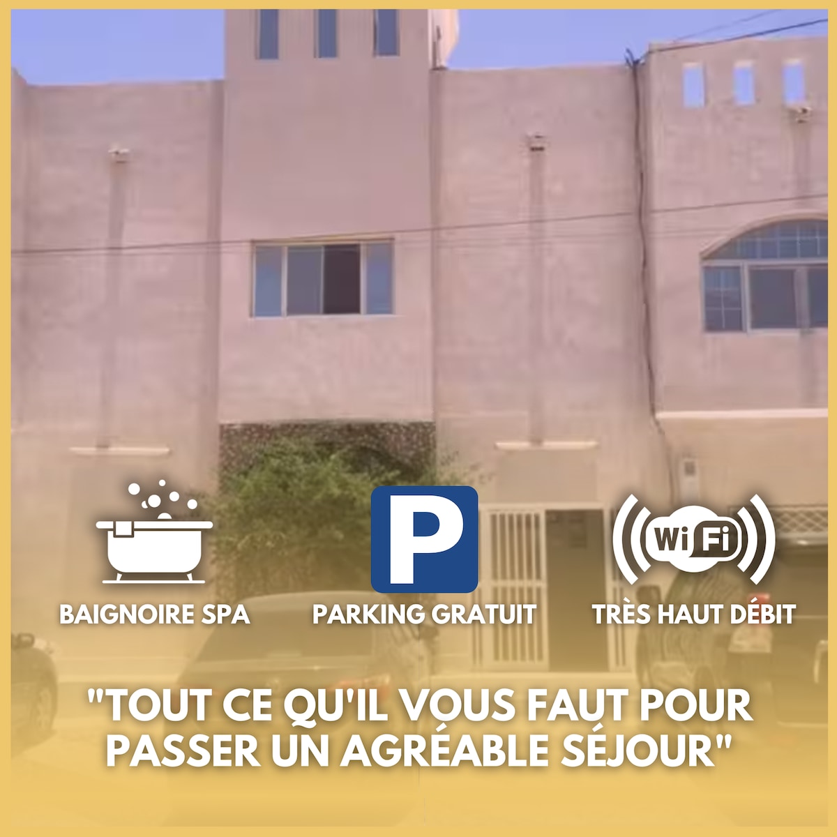 À Nouadhibou, les Appartements Hôteliers Hayat offrent un séjour confortable et moderne à quelques pas de l’aéroport. Wi-Fi gratuit, climatisation, TV écran plat et cuisine équipée pour un vrai confort. Salle de bain avec baignoire, parking gratuit et gardien 24h/24 pour une tranquillité totale. Réservez maintenant et profitez d’un séjour simple, sûr et pratique.