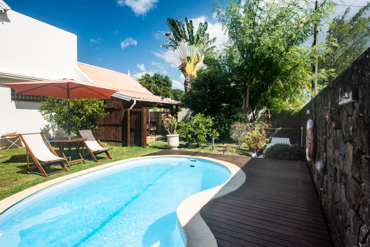 Our little guest cottage is an amazing little "nest" for holiday makers. Tucked right under an old tamarin tree, this little gem studio faces the mythical "Gorilla Mountain" and is simply the most peaceful base from which to discover the West Coast. It's forms part of our one acre "farm-style" property in a gated estate, just 5 mins drive from Tamarin Bay as well as shops and restaurants. Enjoy quiet walks and swims in the pool.