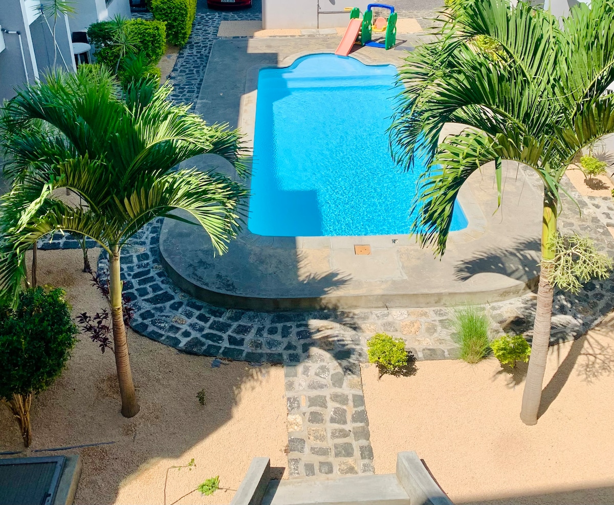 Modern apartment of 90m2, 2 bedrooms, 1 bathroom and toilet, with a terrace. Located 1 minute from the Lux Grand Bay resort, casita bay, Merville beach & Pereybere beach. Ideal for a couple with 1 or 2 children looking for comfort and located near the best beaches in the area. There is the Roof Top with seaviews, and restaurants and supermarkets are 2 minutes away by car. The residence has a Swimming pool, secured parking and elevator. FREE drinking water dispenser- NO need to buy bottled water