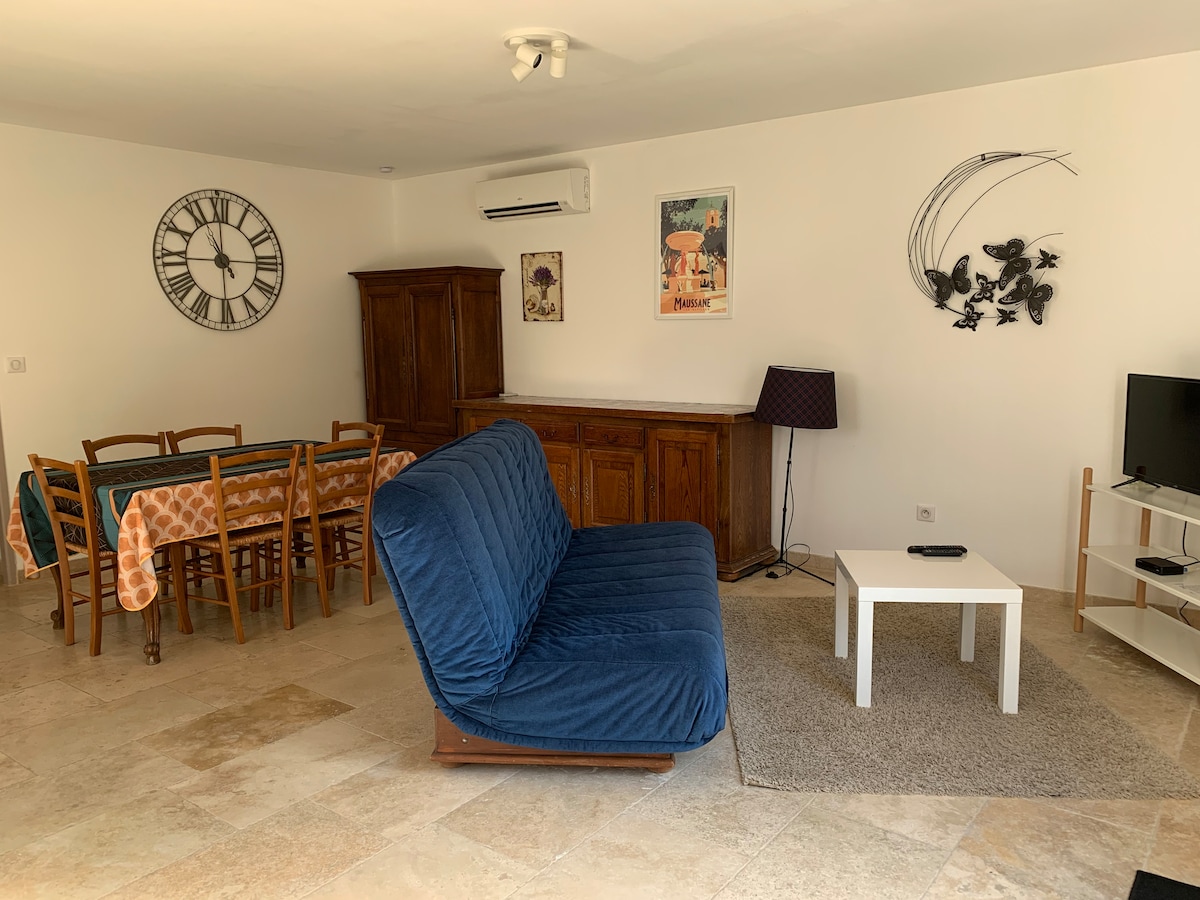 Welcome in Provence! Perfect for 2 persons (eventually 3), a nicely independent apartment in a renovated Provencal farmhouse with a bedroom and it's king size bed (180x200), a bathroom with walk-in shower, a living room with lounge including an open plan kitchen fully equipped and a 3rd possible accomodation on the mezzanine. Enjoy the shaded terrace, the wonderful garden with the 13m x 4m new swimming pool and the petanque ground. Some bicylces and a tennis table are available as well.