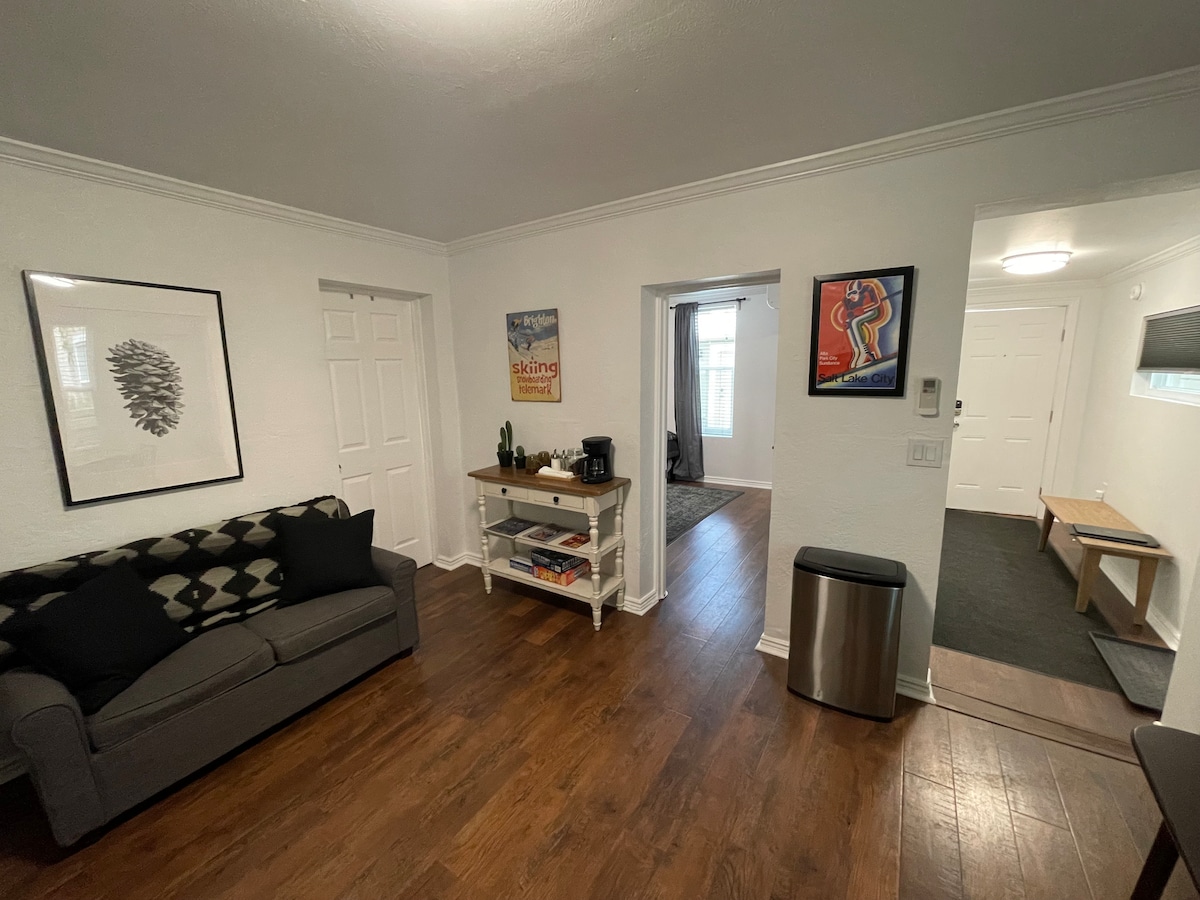 Get ready to call this 2-level 2BR, 1Bath basement apartment "basecamp" while you explore the greater Salt Lake area! Fully equipped with kitchenette (mini fridge, microwave, keurig), wifi, and 58” Roku TV. Dog-friendly too! Conveniently located 12 min from the Int’l Salt Lake Airport, and <2 miles to the I-215 freeway. Situated in a cozy neighborhood only 15 min from downtown SLC and 35-45 min to several world-class ski resorts (Park City, Alta, Snowbird, Brighton, Solitude).
