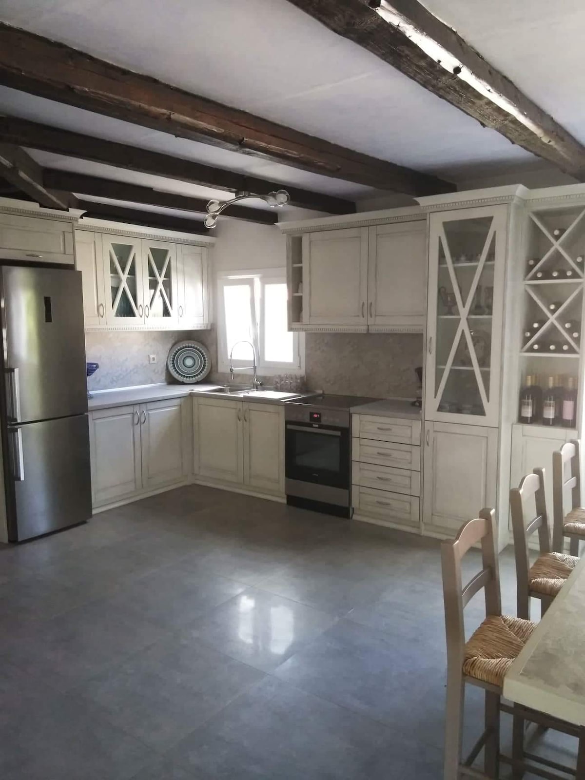 The Grand View Villa is a newly refurbished, but classic, Greek home. From the exposed beams to the classic kitchen, the decor and to the fire place, the home brings a warm, old world feel to a perfect intersection with today's comforts and luxuries. The Master Bedroom hosts it's own private bathroom, where the Guest Room provides two beds for our variety of guests. Two open air balconies side the house, and the living room presents you with a fireplace that can be used at any time.