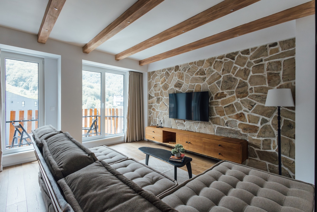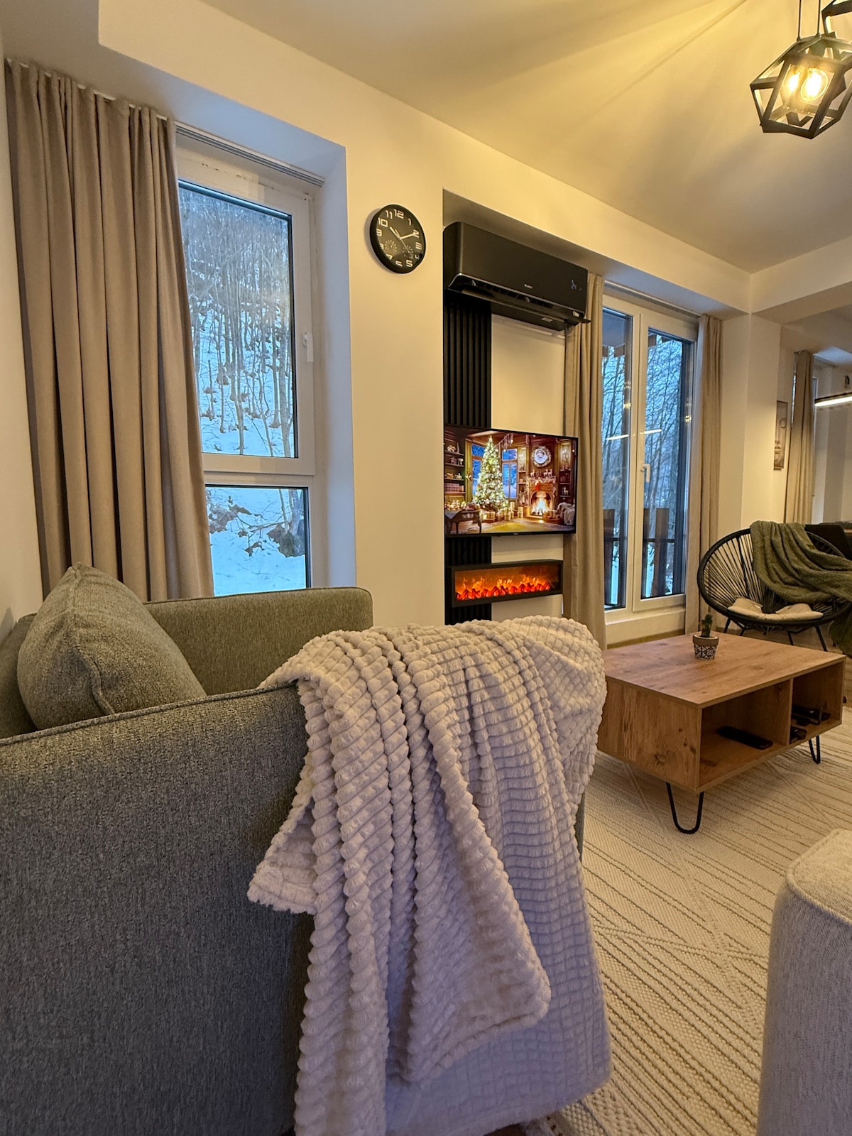 Welcome to your peaceful mountain getaway! This cozy apartment combines rustic charm with modern comfort, featuring stone walls, wooden beams, and unique furniture handcrafted by a local master carpenter. Perched high in the mountains, the balcony is perfect for enjoying your morning tea in tranquility. Surrounded by an evergreen forest, you're just a 10-minute walk from restaurants, sports fields, biking trails, and ski slopes. It's the ideal retreat for nature lovers and adventurers alike.