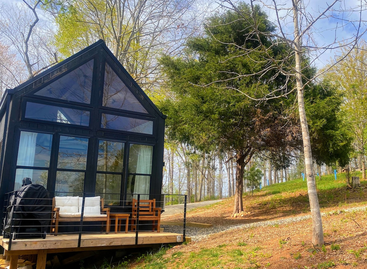 *4x4 or AWD only* Escape to our tiny modern off grid cabin situated in the middle of our private 125 acre mountain top forestry management land which backs up to Pisgah National Forest. Wake up to soaring mountain views, hike all day on the Blue Ridge Parkway, grill out and make S'mores over the fire pit, and then roll open the glass garage door to fall asleep under the stars in a comfy bed...just 25 minutes to downtown Asheville! Heated by a wood stove. All pets are welcome!.