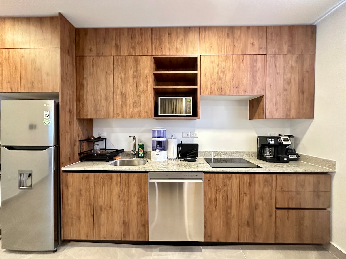 Ubicado en planta alta el Depto Cuenta con sofácama en la sala, un comedor con cuatro sillas, la cocina cuenta con refrigerador, estufa, platos, vasos, tazas, cubiertos, jabón para platos, horno de microondas, utensilios de cocina, sartén, etc; en la habitación cuenta con una cama matrimonial con su juego de sábanas, un buró, televisión con Pluto TV, aire acondicionado y un baño completo con closet vestidor.
