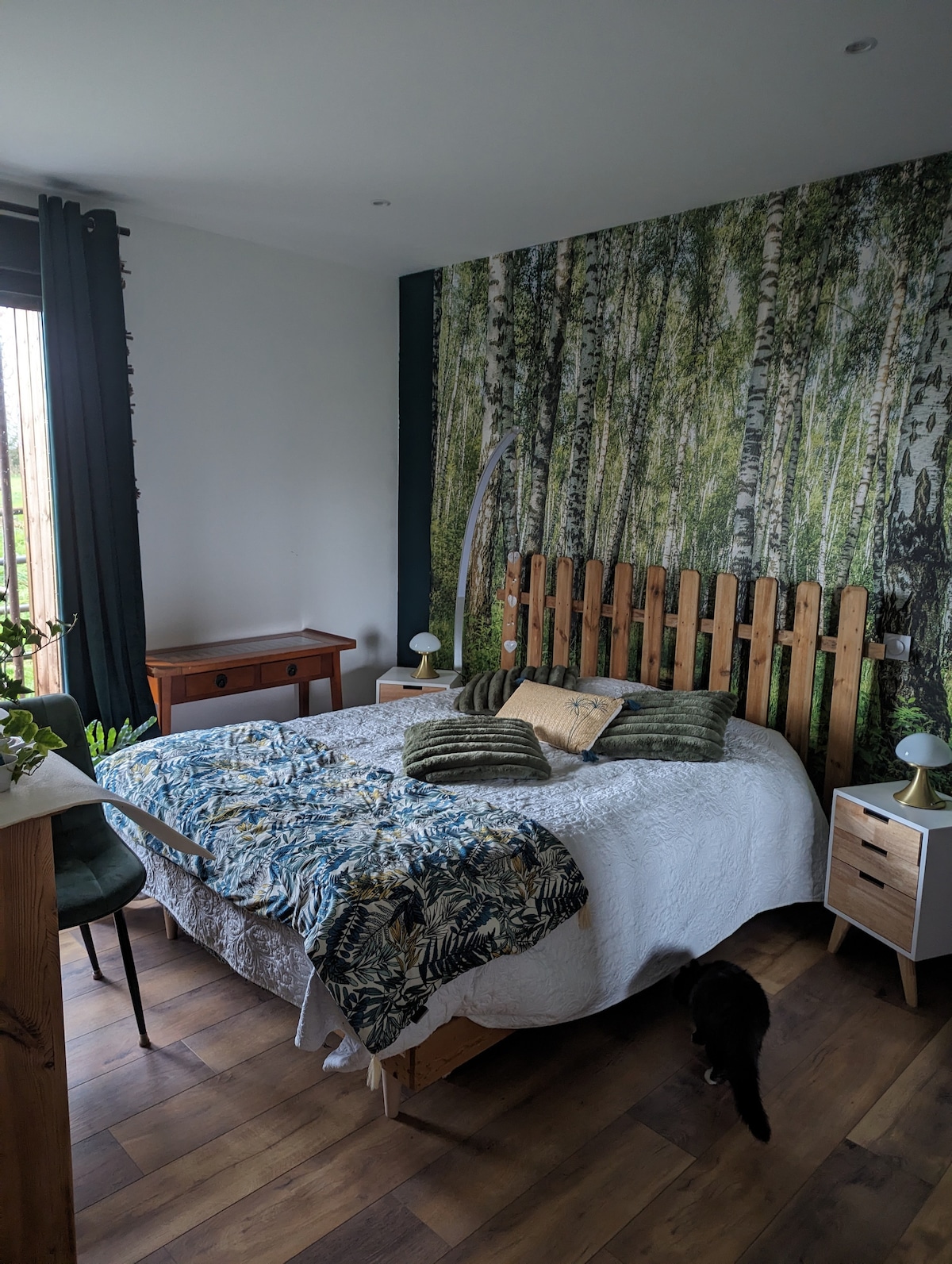 Chambre très spatieuse entièrement redécorée par sa propriétaire. Vous y trouverez un lit central de 140x190, un grand bureau à droite avec un grand velux donnant sur le jardin et la vallée verte. Un coin salon avec fauteuil et une bouilloire pour déguster thé ou café. Sans oublier un dressing, une entrée, bibliothèque et une grande salle de bain privative.