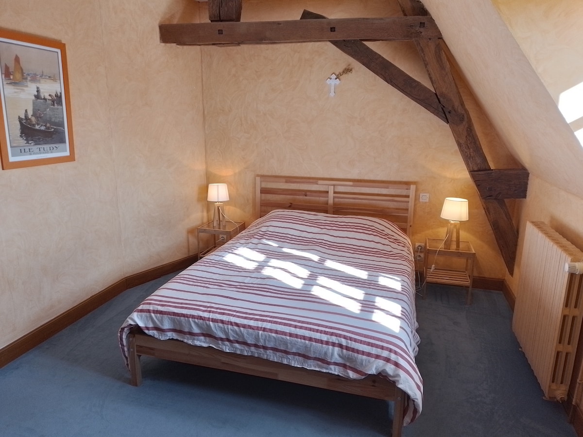 Dans une jolie longère sarthoise, au coeur d'un parc paysagé, nous vous proposons une chambre privée avec un lit double. Dans la pièce attenante, il est possible de loger jusqu'à deux enfants dans un lit (à préciser lors de la réservation, 10€ par personne). En plus d'une salle de bain et de toilettes reservées aux voyageurs, vous pourrez profiter des différents espaces de la maison (salon, cuisine...) et du jardin. Le petit déjeuner est compris.