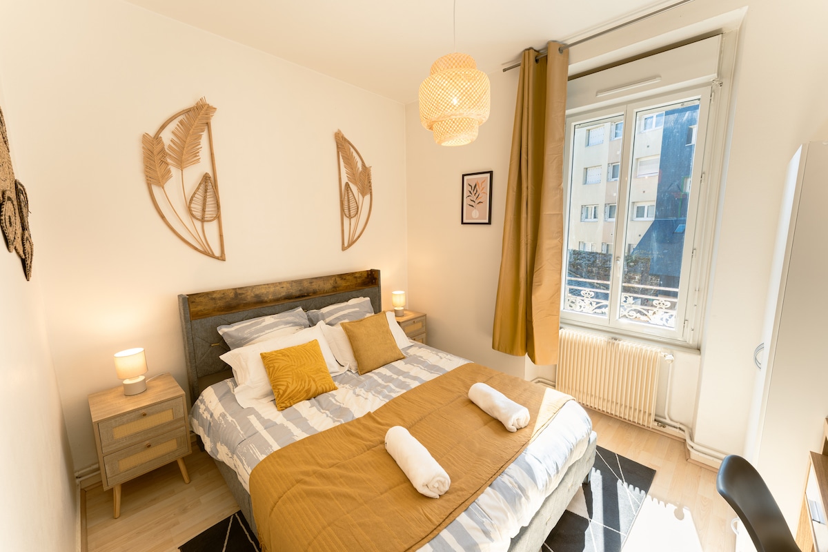 Appartement de 45m2, rénové ,lumineux , calme , près de la rocade , au pied de l immeuble il y a le bus . La cuisine est de tout confort .il y a des places gratuites près de l.appartement . Le canapé est doté d un vrai matelas Au 3ème étage , vous pouvez jouir d une vue dégagée et verdoyante, vous pouvez profiter d un balcon . Le stationnement est gratuit dans la rue . Si vous désirez 2 lits et que vous êtes 2 personnes , ce sera 8 Euros ( especes) supplémentaires pour le lit.