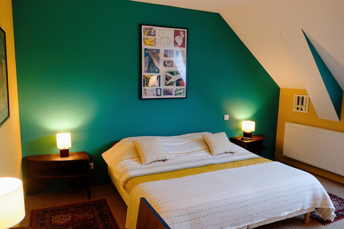 Bienvenue chez nous, donc chez vous ! Petit studio dans la maison, indépendant de la vie de la maison et isolé des bruits extérieurs de la ville. Un lit d’appoint est à disposition. Si vous souhaitez un 3e couchages nous vous proposerons un matelas au sol. Stationnement gratuit devant la maison.. Cuisine, café, thé, tisane, madeleines, bouilloire, frigidaire, micros ondes, plaque induction, équipement cuisine.