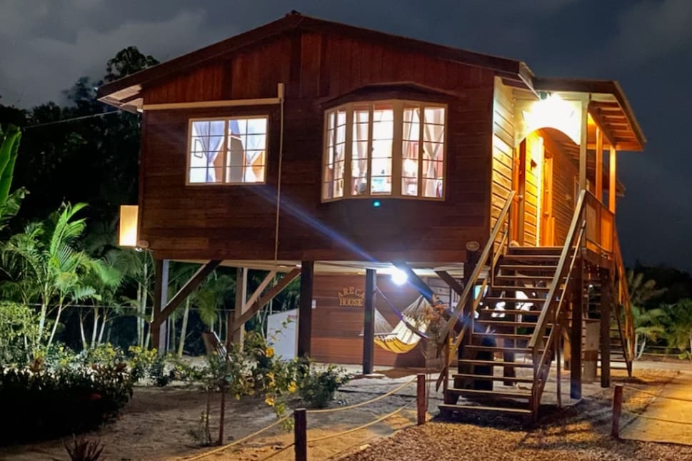 Perched in the Treetops over a Natural 9 ft. deep Jungle Pool, our Treetop is fully Screened for Bug free Living! Sitting room on first level and a screened bedroom with small screened veranda on 2nd level. A futon accommodates a child (7 yrs. or older) on 1st level. The Treetop shares a Common area (50 ft. away) with no more than 2 other guests and includes Hot water, WiFi, Full Kitchen Facilities with dedicated fridge for the Treetop, toilet, sinks, and shower , Dining Gazebo