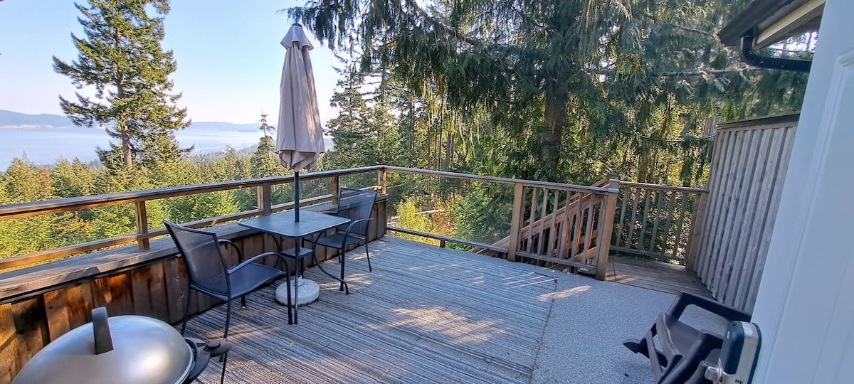 Our Guesthouse is a fully self contained studio that is situated on 5 beautifully treed acres with ocean/forest views. It is perfect for a Romantic getaway that offers peace, tranquility and privacy. Brand new Queen size bed and new queen size sofa bed. Ten minute walk to the village (shopping & restaurants) and beach. We are extremely close to amazing trails and tennis courts. If you are walking on the ferry, please RESERVE your spot!!!!!! Guesthouse is best for two adults and a child.