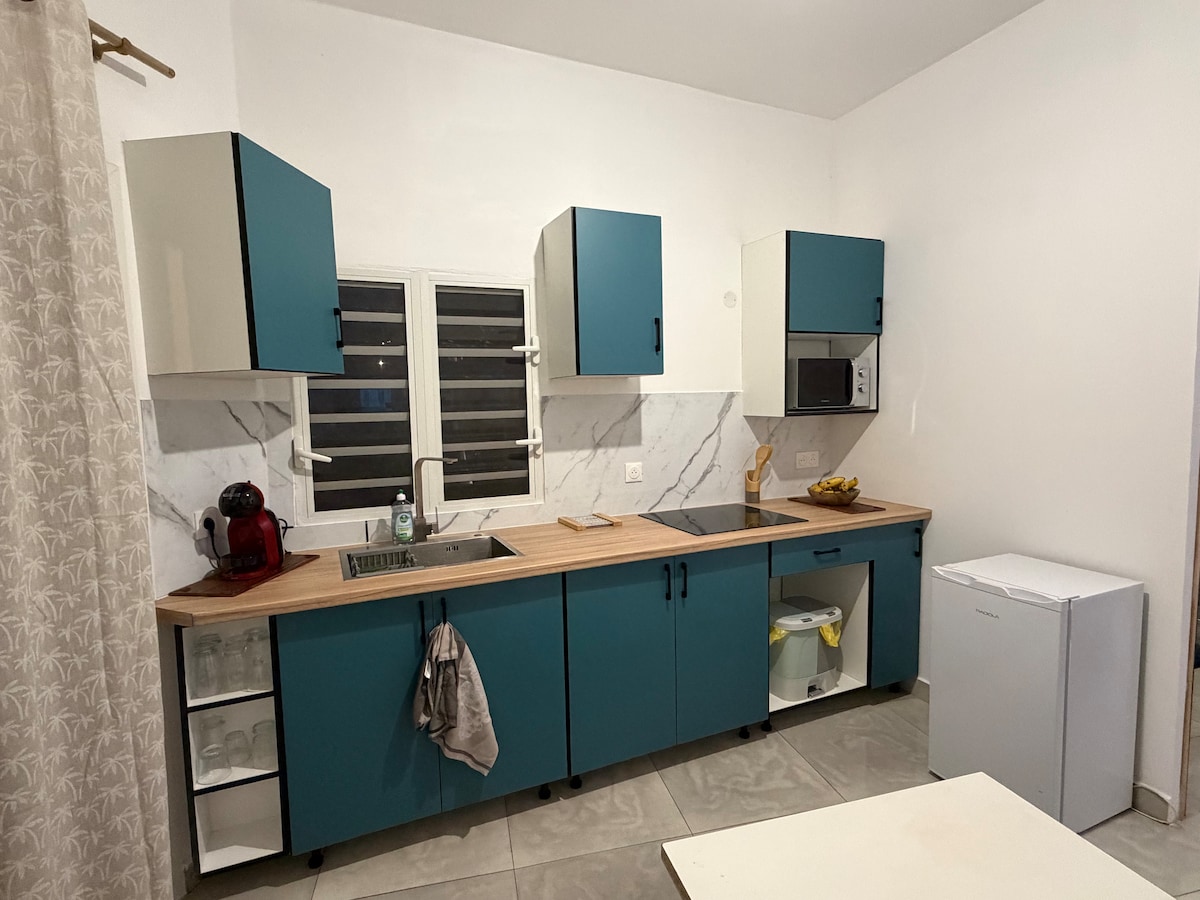 Logement unique, tranquille, paisible . Charmante T2: 1 chambre climatise, salon climatise une télévision + canal +et une cuisine entièrement équipée, un AirFlyer, un micro-ondes, cafetier, bouilloire électrique et réfrigérateur ainsi qu'une salle de bains . Les serviettes et le linge de lit sont fournis. Pour plus d'intimité, l'hébergement insonorisé dispose d'un terrasse avec vue panoramique sur le lagon et ilot de Mtsamboro et une belle couche de soleil. 3 MIN de la plage.
