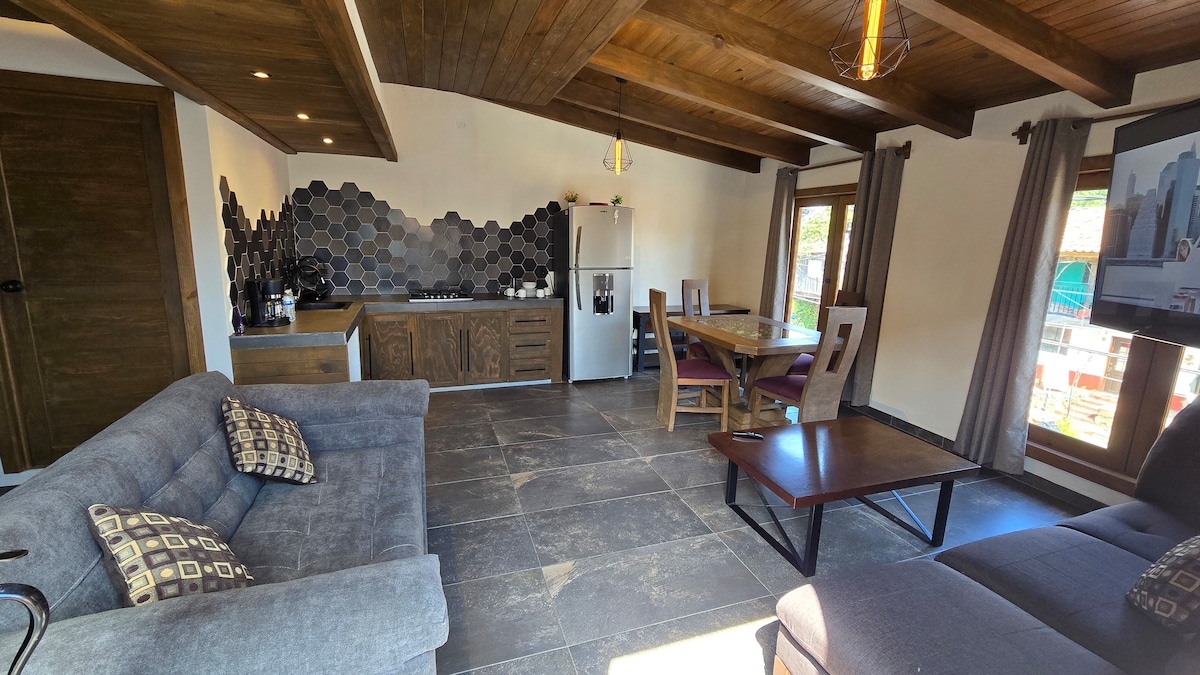 Relájate en este espacio tan tranquilo y elegante, Disfruta del encantador entorno de esta romántica Cabaña Prieta. Se encuentra ubicado a 5 km de la plaza principal, esta rodeada de enormes pinos, cuenta con acabados de lujo, Cocina equipada, Jacuzzi, Terraza con vista Panoramica, TV con sistema Dish. Todo lo necesario para que pases un agradable noche con tu pareja en la naturaleza.
