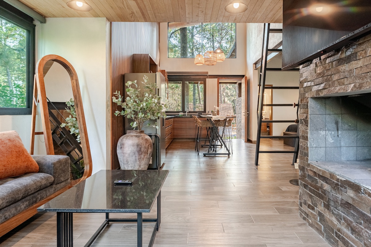 Disfruta de una cabaña en el bosque totalmente equipada para que tu experiencia sea inolvidable. Consigue un descanso de lujo en sus colchones de calidad, diviértete en su terraza con asador y estufa, ten una noche romántica en su terraza con chimenea. Deja que tus hijos corran y rían en la explanada jugando en la casita infantil y quemen bombones en su fogata. Ubicada dentro de la seguridad del fraccionamiento Los Cazos con acceso a La Cascada El Salto.