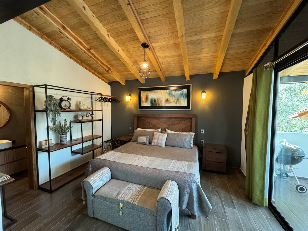Un lugar tranquilo conectado con la naturaleza, cabaña total mente nueva con acabados vintage-industrial de lujo, excelente ubicación, cómoda terraza con asador y balcones para tomar un buen café, con vista a la naturaleza, relajarte en unas cómodas hamacas, excelente para pasar unas buenas vacaciones con la familia o amigos.