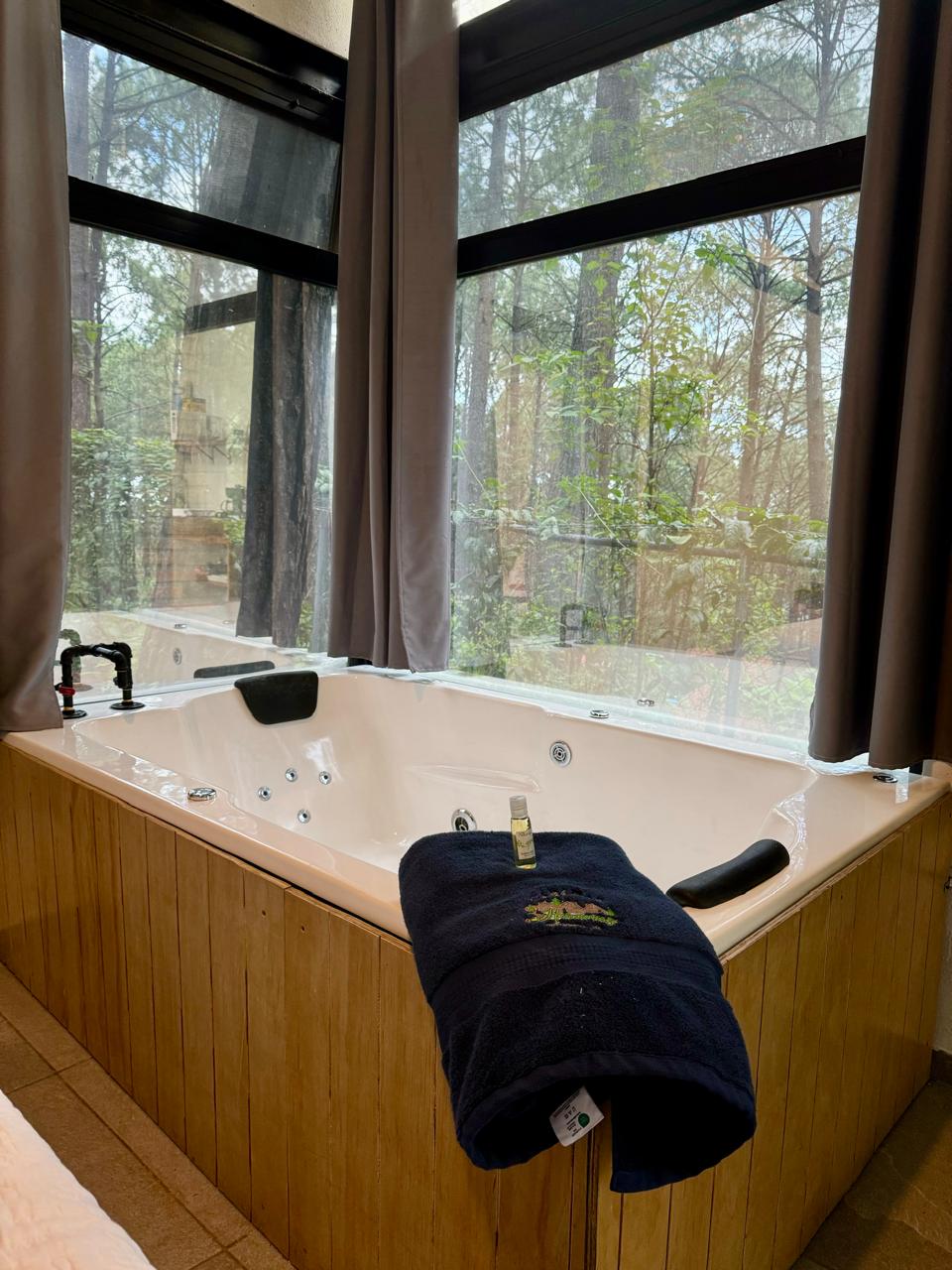 Envuelta en madera y detalles de piedra, es; esa amalgama ecléctica de acabados rústicos y de lujo con la que Buscamos darte esa sensación, en la que el tiempo no tiene significado!! Y solo te preocupes por descansar y olvidarte de todo lo que no importa!!! La cama comodisima, el jacuzzi burbujeante calientito, la chimenea prendida, y tu saliendo del sauna/vapor, listo para disfrutar de la vista desde tu balcón junto a tu pareja, y una copa de vino! esta prohibido fumar dentro de la cabaña!