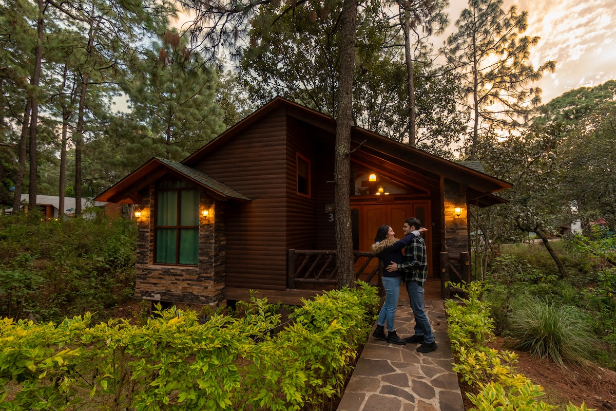 Romántica cabaña rústica para dos personas rodeada por el hermoso bosque del “pueblo mágico de montaña Mazamitla” Equipada con una recámara con cama King Size, cocina y baño completos, comedor y una encantadora sala con chimenea a leña para compartir bellos momentos en pareja. El alojamiento cuenta con varios estacionamientos dentro de nuestras instalaciones, así como con extensas áreas verdes además de estar rodeado de un espectacular bosque.