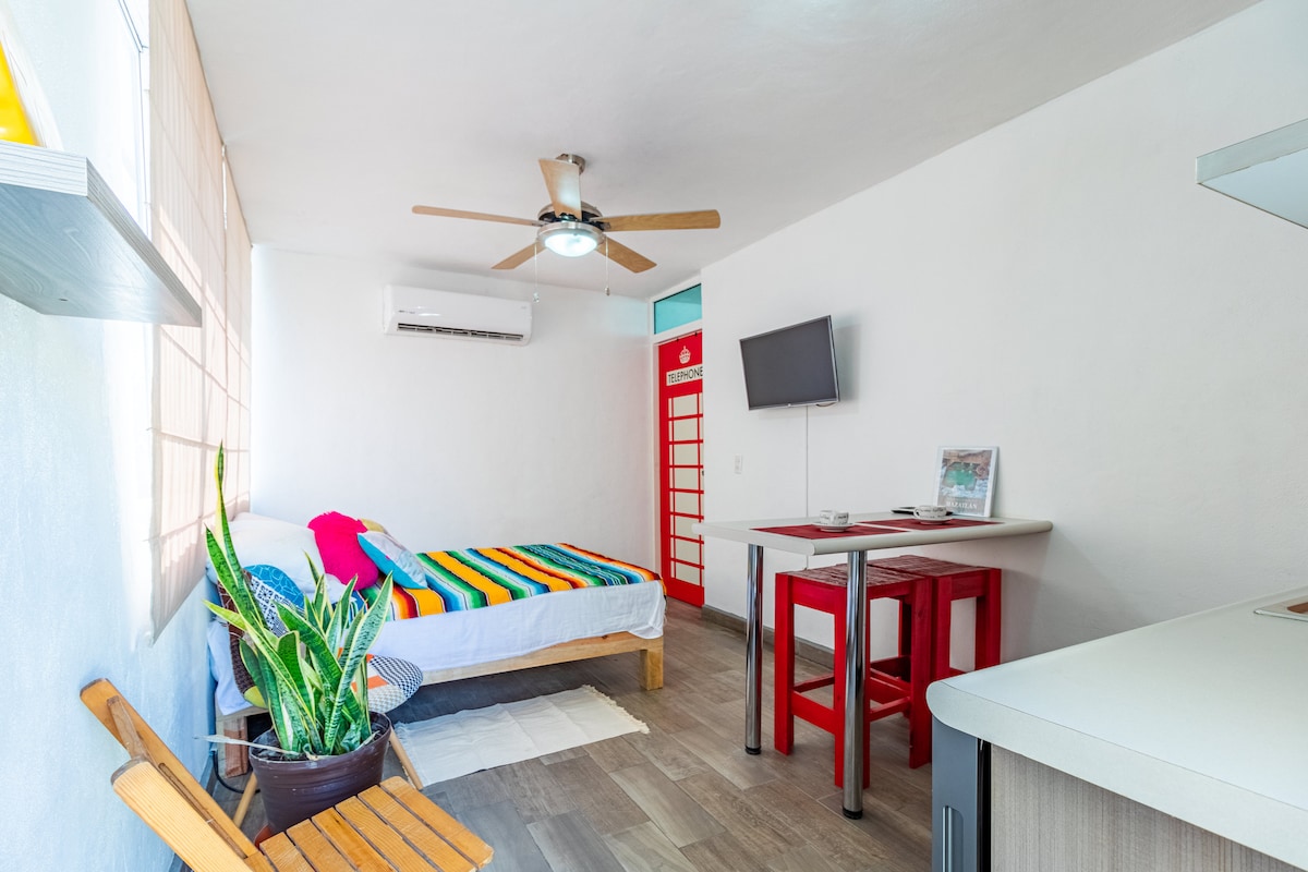 Visiting Mazatlán? Great! We have a superb place. Apartment 2 has what you need: ✔️ First-floor location 🔒 Inside a secure building, accessible by codes 🛏️ Queen bed for 2, max 4 if you rent an inflatable mattress ($300 MXN) 🚽Bathroom 🌬️ Minisplit (AC unit) 🥄 Equipped kitchen 📺 Smart TV 🚀 Internet Plus, there is a terrace with a pool, grill, and bar lounge available on the 3rd floor. 5 min. from the Golden Zone (Zona Dorada) and close to restaurants, Soriana, and Walmart.