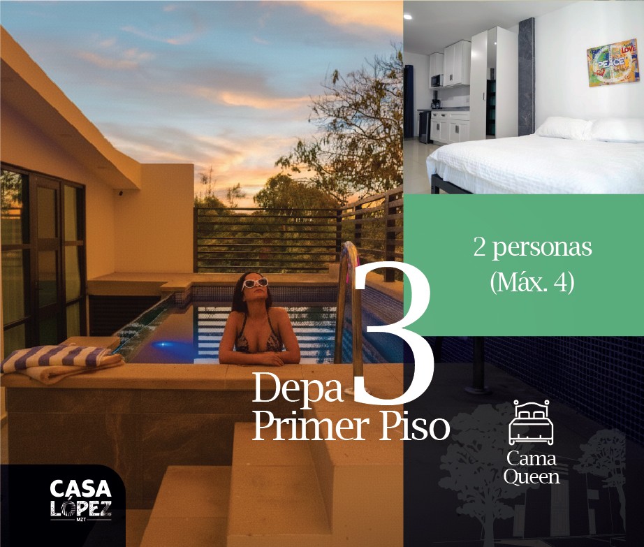 Visiting Mazatlán? Great! We have a superb place. Apartment 3 has what you need: ✔️ First-floor location 🔒 Inside a secure building, accessible by codes 🛏️ Queen bed for 2, max 4 if you rent an inflatable mattress ($300 MXN) 🚽Private Bathroom 🌬️ Minisplit (AC unit) 🥄 Equipped kitchen 📺 Smart TV 🚀 Internet Plus, there is a terrace with a pool, grill, and bar lounge available on the 3rd floor. 5 min. from the Golden Zone (Zona Dorada) and close to restaurants, Soriana, and Walmart.