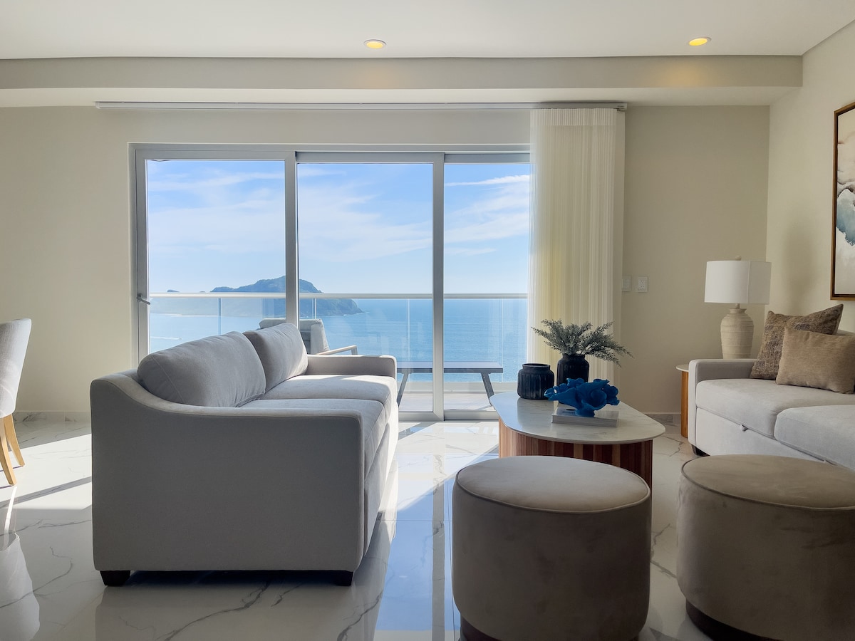 Wake up by the ocean at The Grand O Living, an elegant and cozy space designed to make you relax. Sunrise coffee on the terrace, golden sunsets from the living room. Located on the Malecón, just 50m from the beach, with a resort-style pool, gym and lounge areas. Ideal for couples and families seeking comfort and ocean views. 2 min to Mazatlán Letters 5 min to New Aquarium 4 min to Teodoro Mariscal Stadium