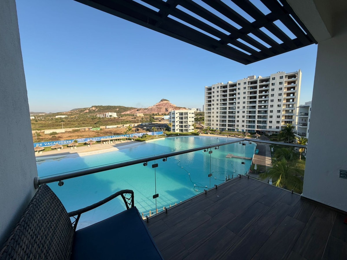 Enjoy a unique experience in this beautiful apartment located in Bluú Habitat Lagoons, an exclusive development featuring the largest crystal-clear lagoon in Mazatlán. Relax in a luxurious environment with access to private beaches, a gym, panoramic terraces, sports courts, green areas, and more. Perfect for families, friends, or romantic getaways. The location and amenities will make your stay unforgettable. Book now and enjoy an exceptional vacation! 🌊☀️