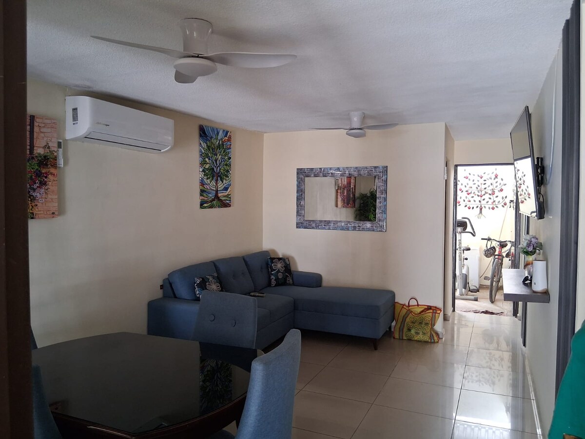 La ubicación del departamento es privilegiada, estás a la mitad del malecón de norte a sur, a 1 cuadra del mar, 2 cuadras del acuario, y 2 cuadras de la central camionera, cuenta con 2 recámaras en la principal encontrarás una cama queen, y en la otra recámara 2 camas individuales, un baño completo, cocina y sala, alojamiento para 4 personas y puede alojarse una quinta en la sala en un colchón infable.