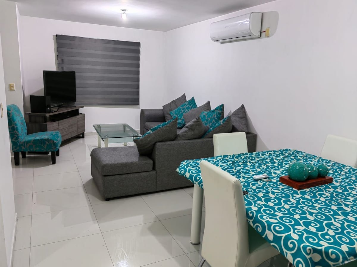 Disfruta unas merecidas vacaciones en nuestro cómodo apartamento, ubicado a solo 6 minutos caminando de la playa. Contamos con Wifi, 2 smart TV, minisplits y cocina completamente equipada. Podrás relajarte en nuestro amplio balcón y disfrutar de las áreas comunes, tendrás acceso a la piscina, camastros y asador. El apartamento cuenta con 2 habitaciones y 2 baños completos, 1 king size, 1 matrimonial y 1 sofá cama matrimonial en la sala. Está ubicado en el segundo piso, no hay elevador