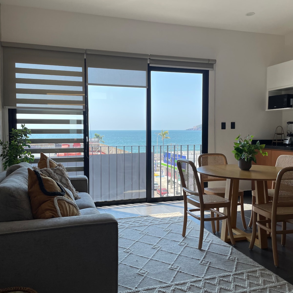 Vive una experiencia acogedora en este encantador loft, ubicado en el corazón de la Zona Dorada de Mazatlán. A sólo 5 minutos caminando de la playa, estarás rodeado de restaurantes, bares y tiendas. Disfruta tu café en la terraza privada por la mañana o relájate al atardecer con una copa y las espectaculares vistas de la Zona Dorada, la isla y el mar mientras compartes momentos inolvidables al aire libre.