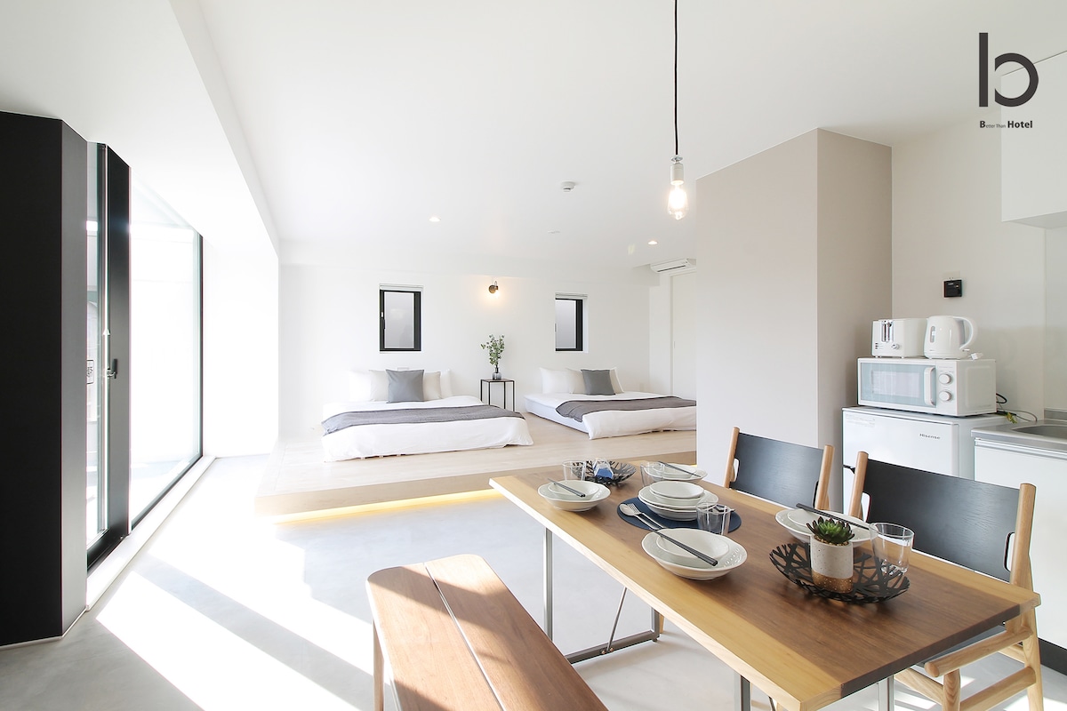 55 sqm studio apartment in central Hiroshima with city view balcony. Good for 6 ppl. With elevator and features smart lock for all guests security. Room wifi provided. With complete amenities : living area; dining and kitchen area. Comes with washing machine. Separate toilet & bath. Toiletries are provided too. Surrounded with convenience stores and restaurants. Great for group of friends and families.