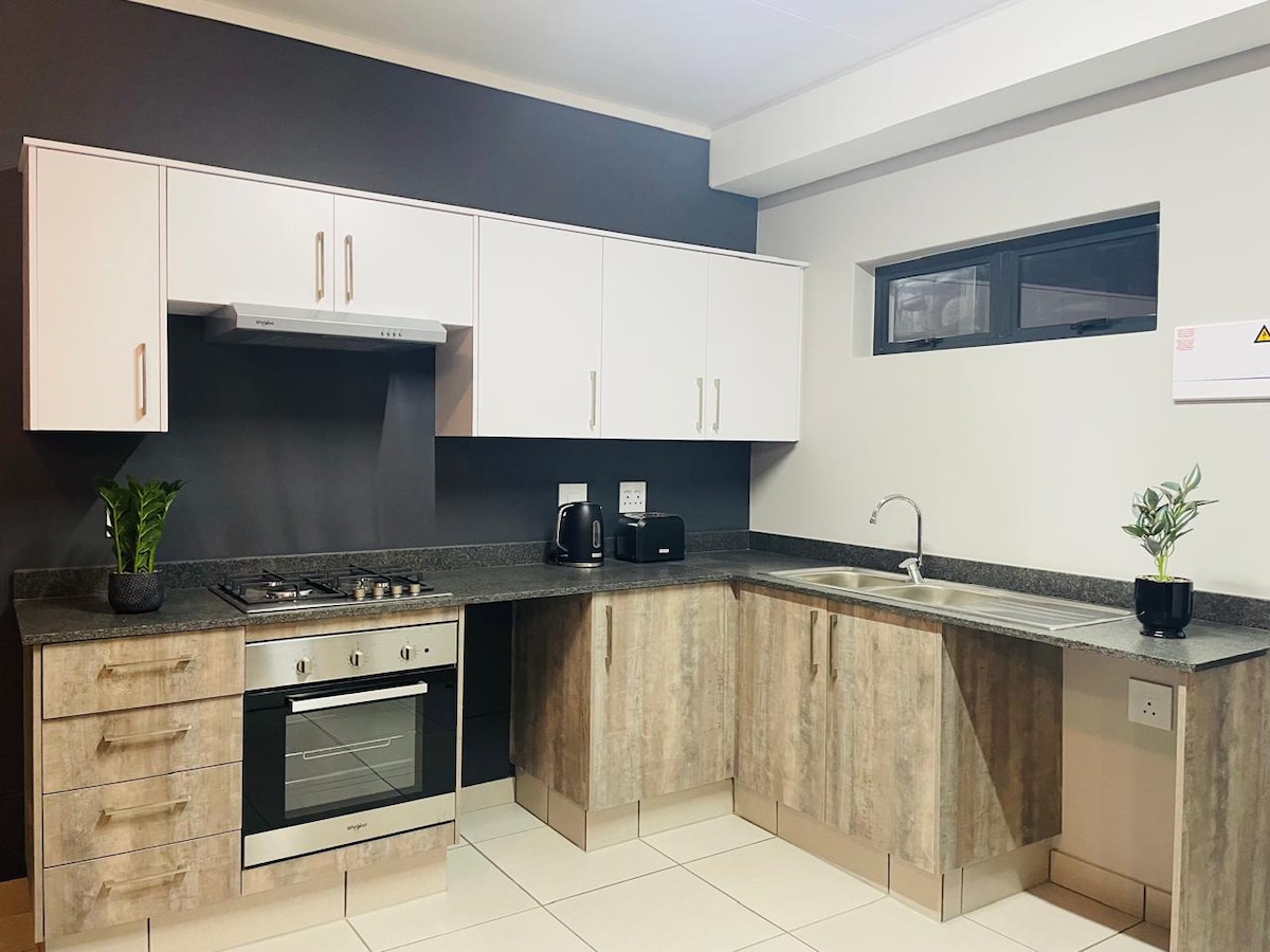 Self-catering, quiet neighborhood. Safe parking with own entrance. 0.5 km from Mediclinic hospital and West End shopping center with Spur, Debonair and Fish a way. Food deliveries available. 2km from Innibos, public transport available. Extra beds available.