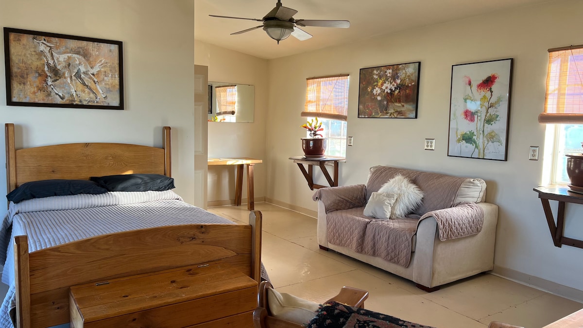 Quaint in the hills of Southern Ohio. This studio apartment is a one bed room with a lovely view overlooking the outdoor horse riding arena. It offers a kitchenette and sitting area downstairs. Upstairs has a queen size bed over looking the riding arena. A country setting at it's best. Pet friendly. Trailer Parking available. Some weekends we host equine events. Horses and exhibitors will be around the facility. There is a horse arena in front and at times you can watch !