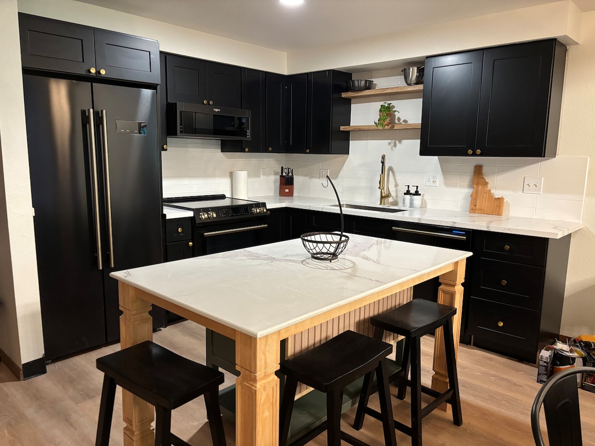 Built in 2020, this charming 3-bedroom, 3-bathroom home offers the perfect blend of modern comfort and rustic charm. Each of the three floors features a cozy bedroom and a stylish bathroom. Enjoy the fully equipped kitchen, spacious living areas, and serene forest views. Unique decor elements, from the vintage toboggan and skis to the vintage poster mountain art, add a touch of local flavor. Perfect for a tranquil getaway or an adventurous retreat.